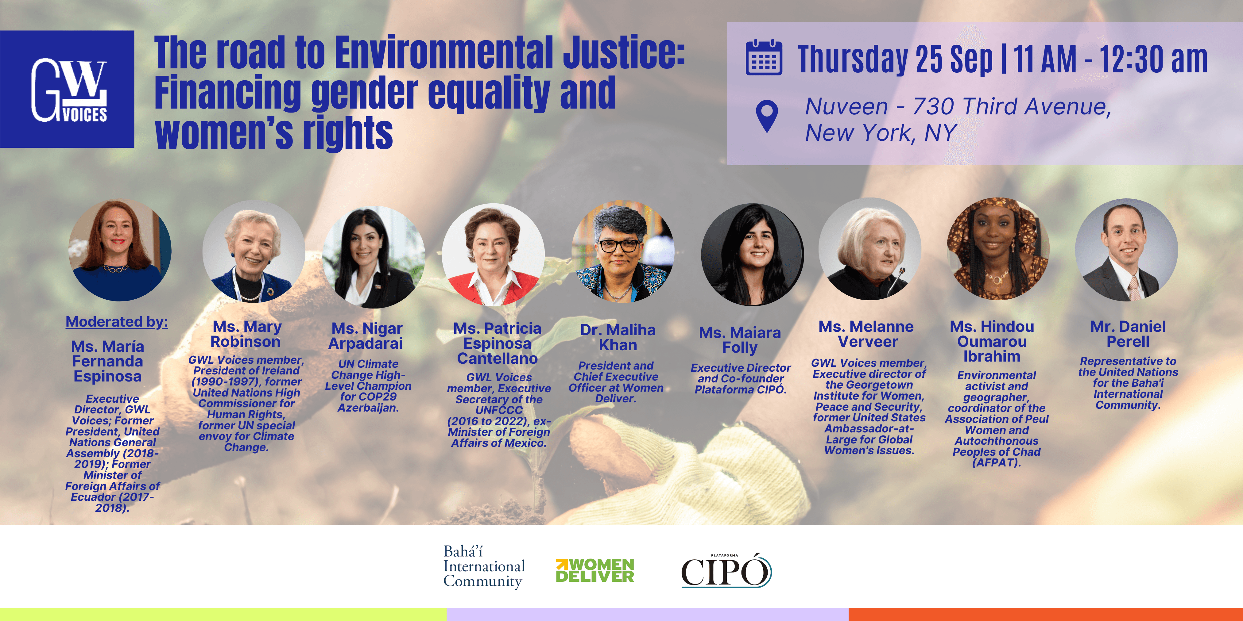 As the world approaches COP30 in Belém, gender equality and women’s rights remain at the heart of the climate justice agenda. Hosted by GWL Voices and Women Deliver, with collaboration of Plataforma CIPÓ, and the Baháʼí International Community, "The Road to Environmental Justice: Financing Gender Equality and Women’s Rights" will bring together leaders in climate governance, finance, and women’s rights for a high-level discussion during Climate Week NYC.
